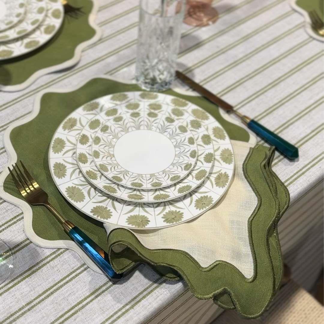 The Lily Placemat in Ivory features a softly scalloped silhouette finished with a delicate olive trim for a fresh, refined look. Classic yet playful, it adds a subtle pop of color while remaining versatile